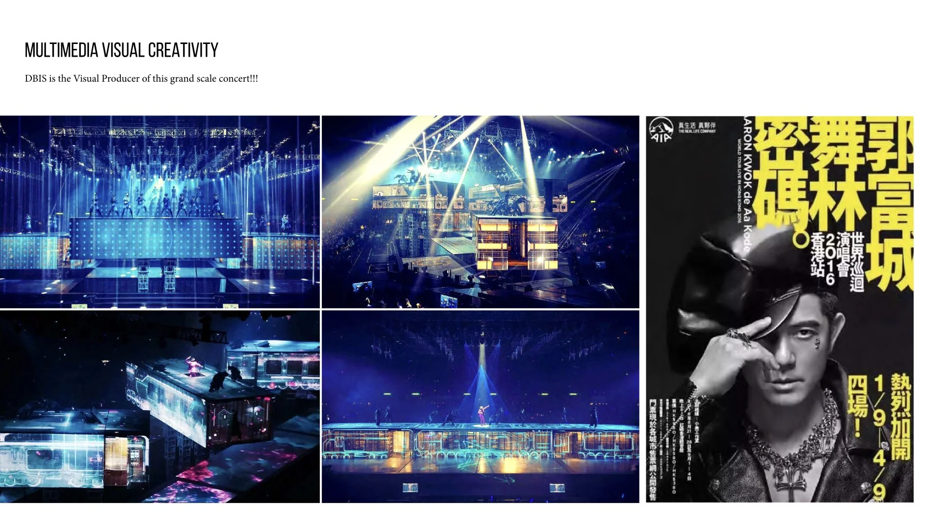 My expertise spans a broad spectrum of multimedia design for concerts and theatrical projects, where I've had the privilege of collaborating with some of the most prestigious names in the entertainment industry. This rich experience has enabled me to orchestrate unforgettable moments that resonate deeply with audiences. Throughout my career, I have been actively engaged in over 200 multimedia theatrical projects, collaborating with renowned entities such as the Edward Lam Dance Theatre, Stan Lai, and participating in Dadawa's "Hear the World" Concert and Yang Li Ping's "Peacock" performance. Since 2000, I have contributed to more than 200 multimedia designs for pop concerts, working with a who's who of the industry, including Aaron Kwok, Andy Lau, Jacky Cheung, Sandy Lam, Eason Chan, Leon Lai, Faye Wong, Sammi Cheng, Leo Ku, Coco Lee, Joey Yung, & Josie and the Uni Boys…etc.